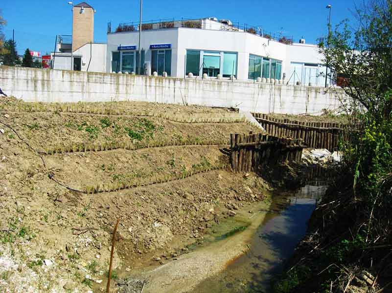 La piena del torrente aveva eroso parte dell'argine e giardino. Ripristinato l'argine, la piantumazione ha consolidato la terra riportata evitando danni alla piena successiva. Si noti la differenza tra l'argine piantumato e quello no.